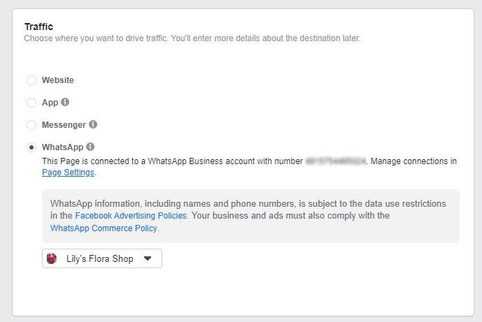 Note that only ads with the traffic, conversions, messages, reach, brand awareness, engagement, and video views objectives can direct users to WhatsApp.