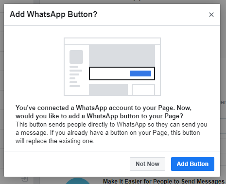 Immediately after you've entered your code, you'll be prompted to add a WhatsApp button to your Facebook page. We highly suggest doing so to provide your customers with an additional channel through which they can reach you on WhatsApp.